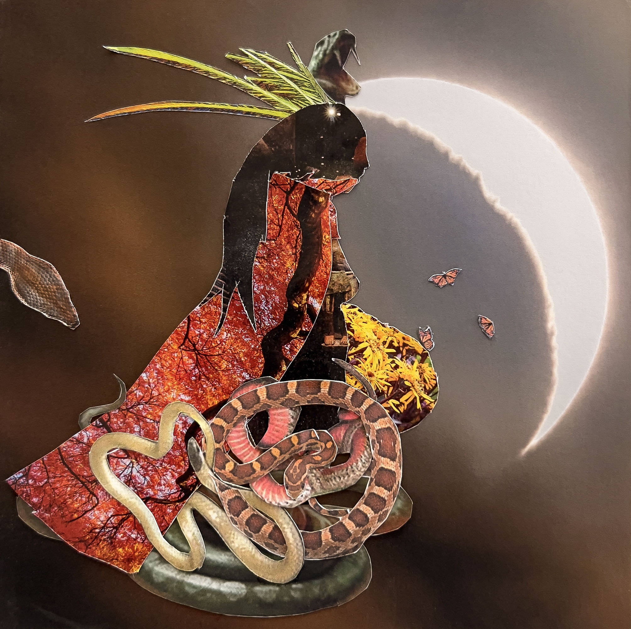 Bio: Through her professional landscape and wildlife photography, Shelly has found a path to channel my deep connection with the Divine Feminine and Mother Nature, with the creation of hand-crafted analog Goddess collages. She celebrates herstories and revered divinities from ancient & modern cultures that are aligned with the natural cycles of the universe, earth, and the moon, dark and light, death and rebirth. The symbolic and metaphorical representations are focused on the beautiful power of each of these entities, not the devalued, horrific, monsters they were made into by dictatorial religion or the patriarchal Gods. She hopes to inspire exploration of your inner Sacred Feminine and reveal a special energy with nature and spirituality. In 2023, she won the Collage Artist of the Year Award at the Art Comes Alive competition and show with ADC Fine Art, and in 2022 received the Mills College Nancy Cook Fellowship Award. Shelly exhibits her work in solo and group shows, and juried art fairs throughout California and neighboring states and have been a photographic finalist in many competitions. In 2022, Shelly received a Master of Fine Arts in Studio Art degree from Mills College, Oakland California, and resides in Nevada City, CA.